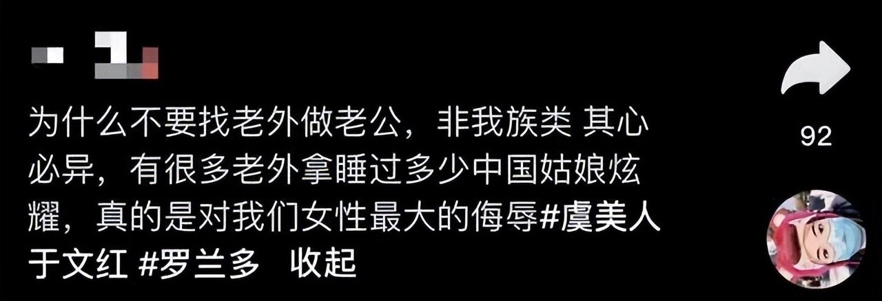 除此之外,博主还称的确有许多外国人拿与多少中国女生有关系来进行炫耀,并劝于文红好好关注一下老公的生活状态。