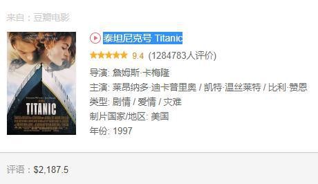 3泰坦尼克号 Titanic,全球票房21.87亿美元