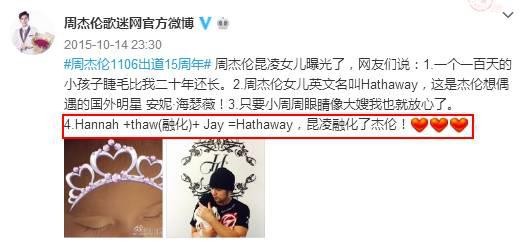 这个名字乍的一听并没有什么特殊的,但是网友却对名字进行了拆分,发现名字背后的含义真的是分外甜蜜,纷纷表示成为了柠檬精,其实这个名字就是Hannah(昆凌)+thaw(融化)+Jay(周杰伦)的意思.....周杰伦在一次品牌代言的活动中也认可了名字背后的含义,这样隐晦的秀恩爱真的是非常让人遭不住啊。