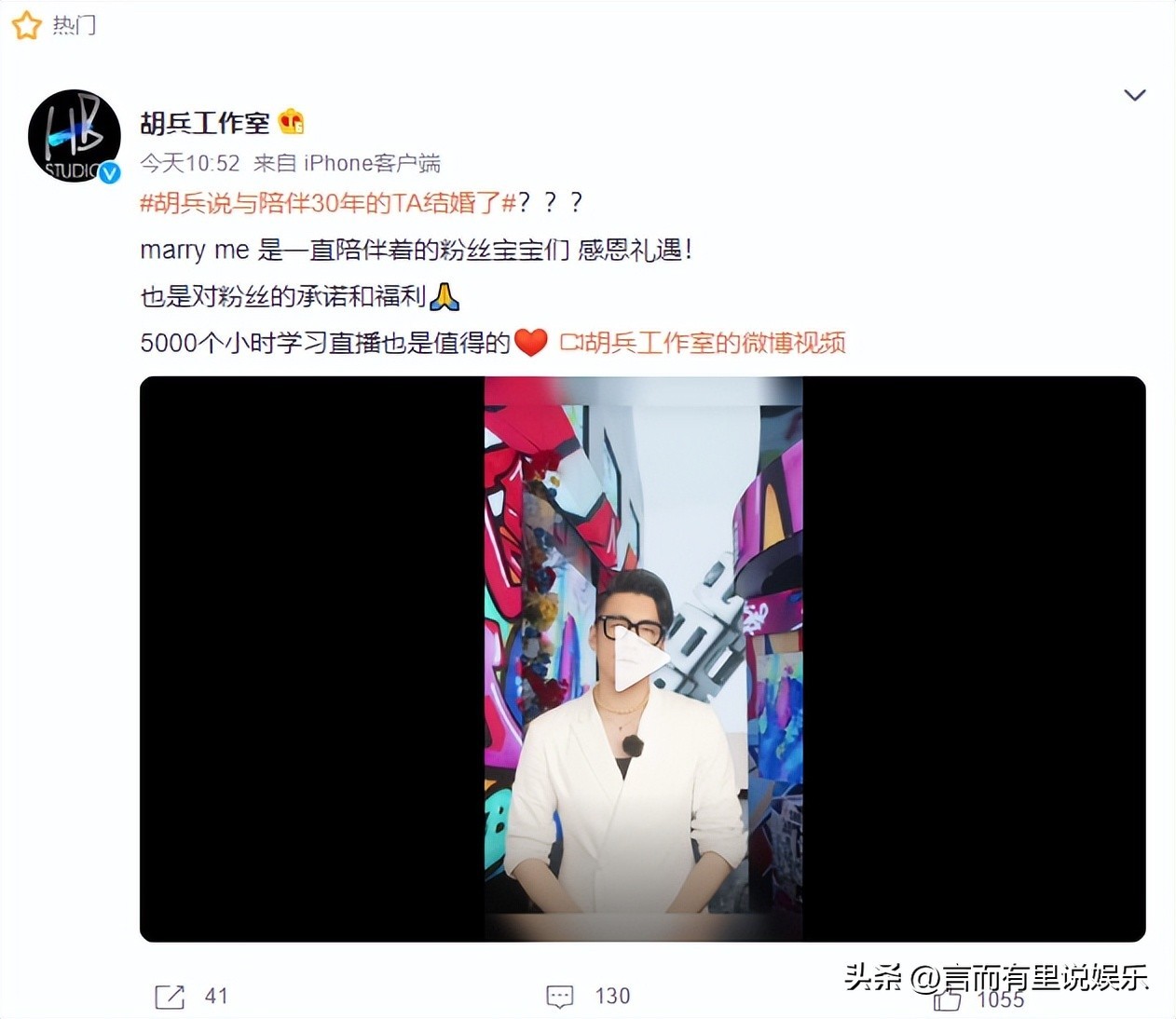 也是受到好奇心的驱使,我去找了胡兵的工作室,工作室的发文中我们看到胡兵特地给大家录了一个视频,文案是“marry me是一直陪伴着的粉丝宝宝们,感恩礼遇,也是对粉丝们的承诺和福利,5000个小时学习直播也是值得的”。