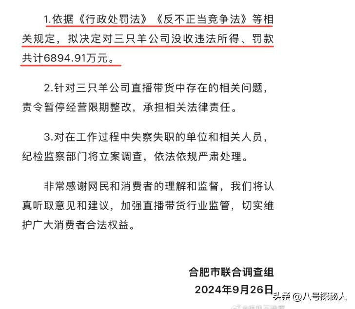 针对两起案件,合肥市联合调查组判决三只羊公司没收违法所得及罚款6894.91万元。
