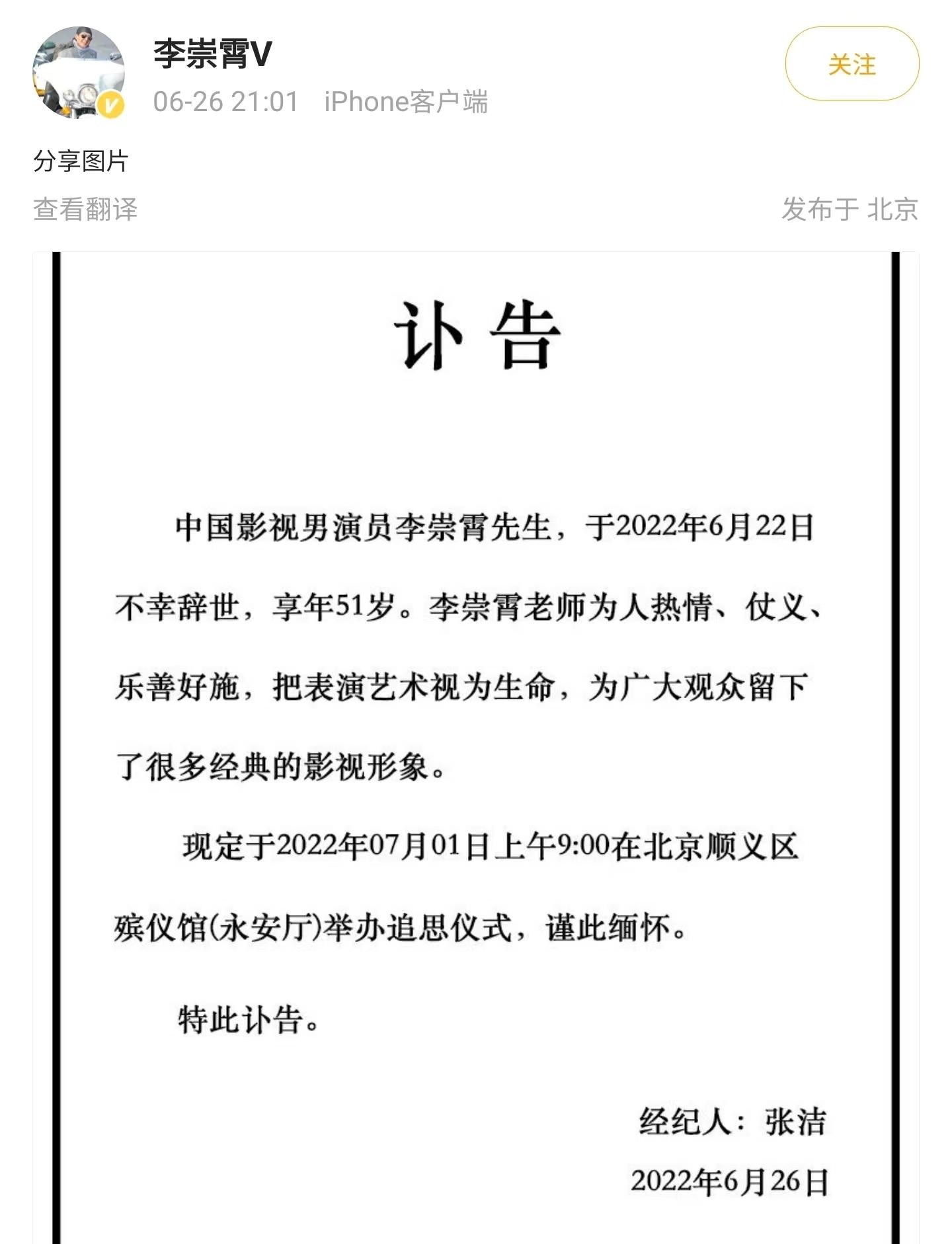 明星李崇霄51岁去世,留下妻女悲痛欲绝,再也不能一起过父亲节了