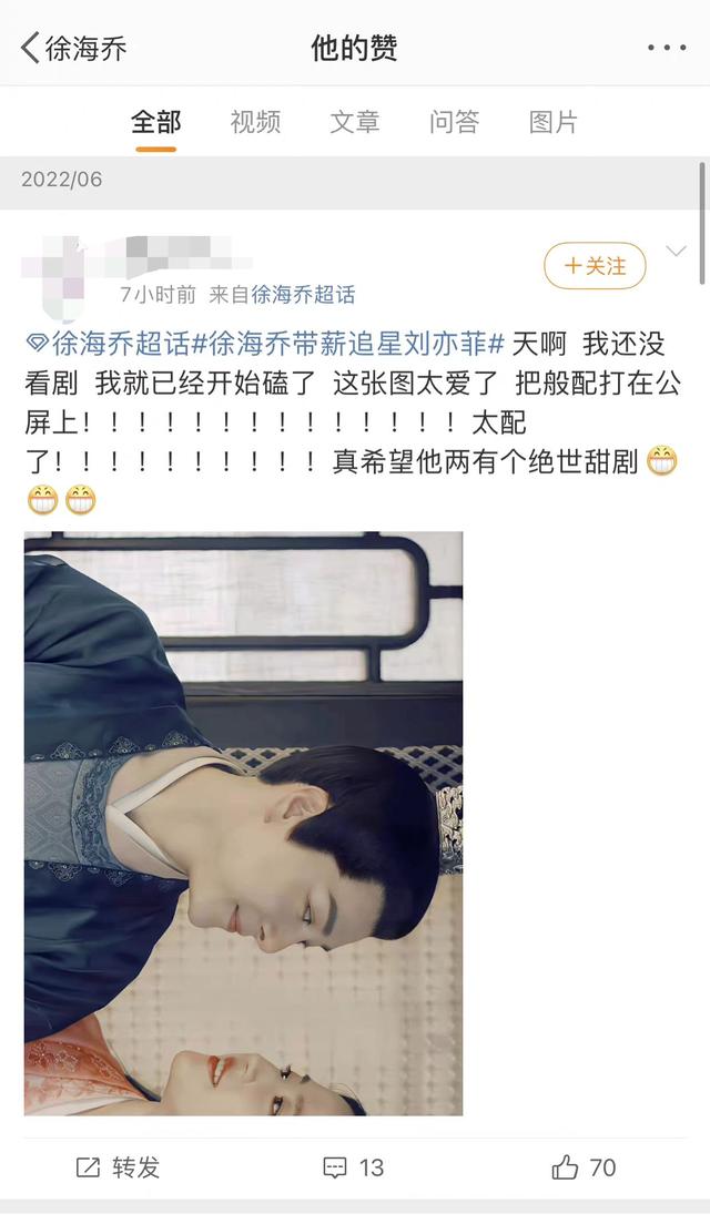 剧中欧阳旭的扮演者徐海乔也是刘亦菲的狂热粉丝,接下来就盘点一哈徐海乔的粉丝行为:首先徐海乔之前透露自己在看了欧阳旭的人设后本不打算接这部戏,但是得知女主是刘亦菲后毫不犹豫地接下此剧本。