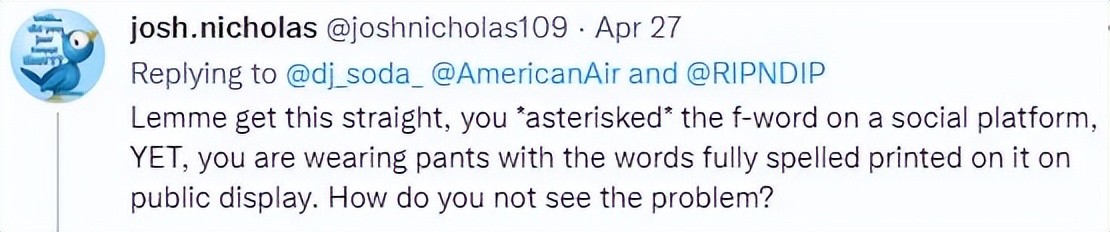 “恕我直言,你在社交平台上都要用F*** YOU来加以屏蔽,你的裤子上却印满了这个词,你怎么看不到问题?”