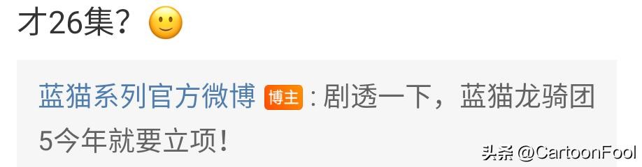 大家应该知道葛平老师就是蓝猫的配音了,那看样子其他角色的配音应该也不会有太大的调整了!并且蓝猫系列官博在回复网友的“才26集”的问题的时候就剧透了《蓝猫龙骑团5》今年要立项的消息!