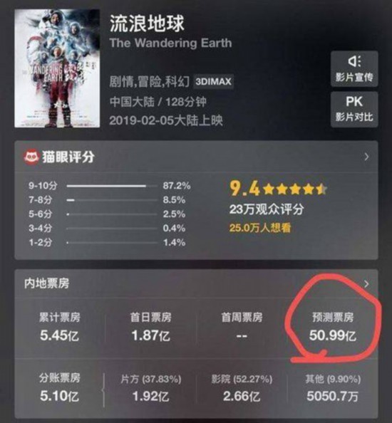 《流浪地球》逆袭而上!院线连夜增加排片量,票房预测超过50亿!