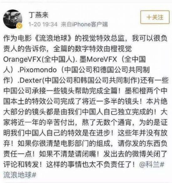 影片的视觉特效总监发微博证实,本片特效基本都是中国公司完成。国产科幻大片已经不是未来可期,而是大有可为了。