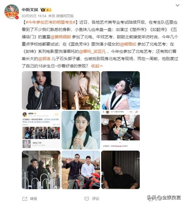 中新文娱2025年3月5日发布的今年参加艺考的明星考生报道