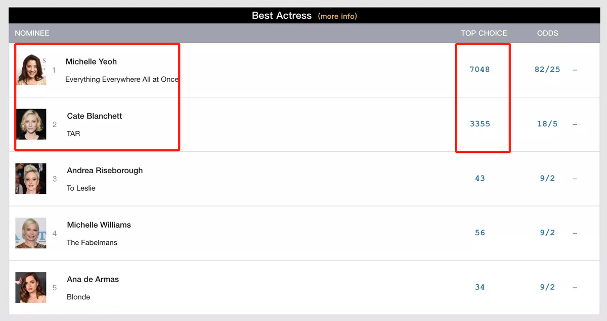 (杨紫琼在网络上的影后预测榜单中,以7000多票领先布兰切特的3300多票)