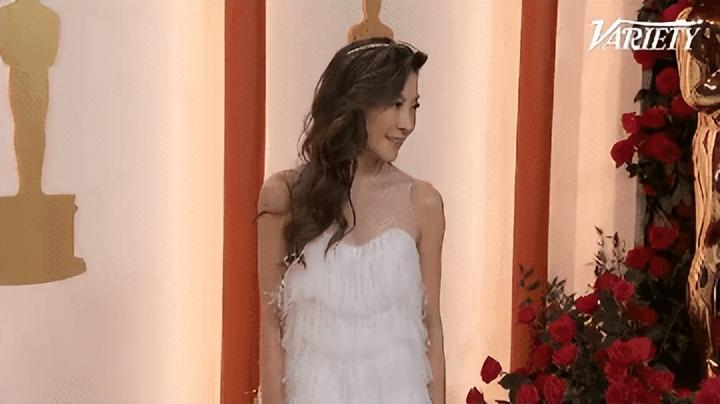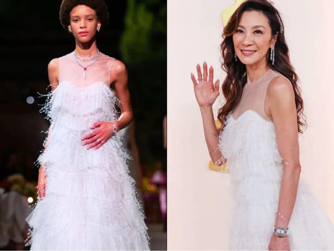 穿着Dior 高定礼服裙,配白色流苏羽毛,杨紫琼造型轻盈,有种珍珠般莹润的光彩。