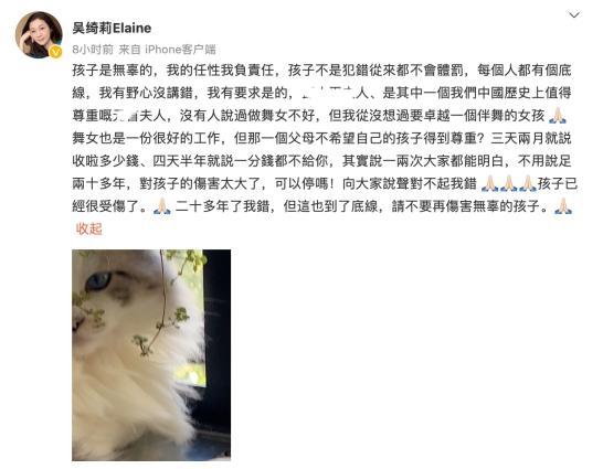 吴绮莉在发文中还表示:她知道自己很有野心,但是她表明,虽然这二十年的时间她确实有错,但是这已经伤害到了她的底线,请不要去伤害一个如此无辜的孩子,看到吴绮莉的发文,人们似乎可以感受到,她现在是多么的诚恳,言语之中也是非常认真的在进行反思。
