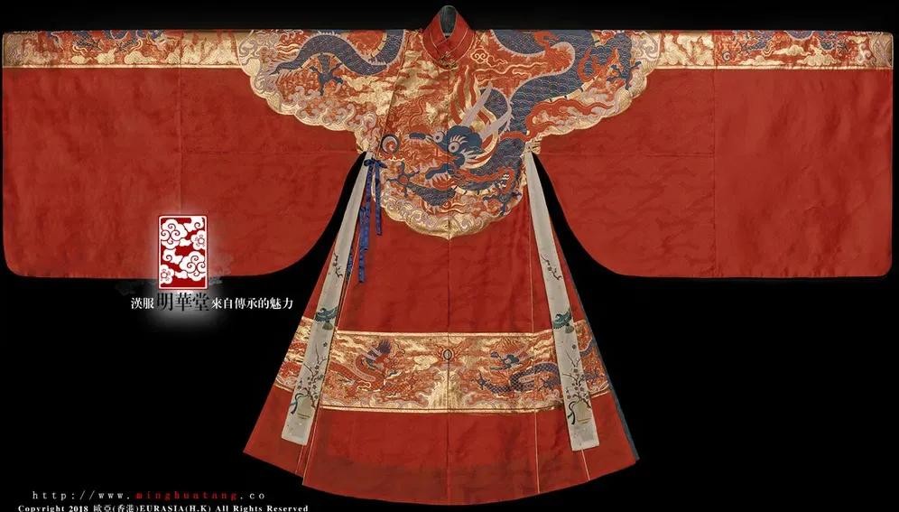 明华堂对汉服传统纹饰的研究与复原是其备受追捧的原因。2018年推出的“过肩蟒云肩通袖妆花织金纱”单品,从孔府旧藏明代服饰中获取灵感,采用了明代蟒龙、如意云、海水江牙等经典元素,并通过对金、青、红、白、黑五色的搭配运用,呈现出奢华、文雅的风范。在严格遵循传统服饰样式的同时,明华堂在袖长、袖宽,以及领口等的设计上,都会根据顾客的实际需求订制,只有这样才能让汉服使用场景更符合当代生活。