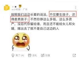 然后在有的网友眼里,事业成功、结婚生子还不算完,最后生的 " 还得是男孩 "。为啥呢?因为挣这么多钱,这么多资产最后没人继承," 而且还不能给女儿和女婿,嫁出去了就不是自己这边的人 " 了。