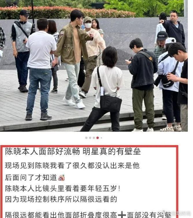有网友在现场偶遇了陈晓,大赞他的面部线条流畅,真的有明星的壁垒。虽然和工作人员的穿着差不多,但是他的头小脸小,在人群中还是很引人注目的。他看起来比照片里要年轻5岁,没有攻击性,是一个很年轻的少年!