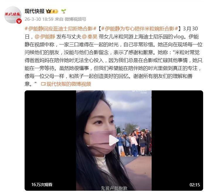 原来,这次迪士尼之行对伊能静一家而言格外珍贵。她在视频中透露,由于工作繁忙,一家三口能完整团聚的时光并不多,因此她与丈夫秦昊格外珍惜这次全心陪伴女儿米粒的机会。伊能静表示,先说声很抱歉,没有让大家拍照,因为 " 一家三口难得在一起,我很珍惜 "。