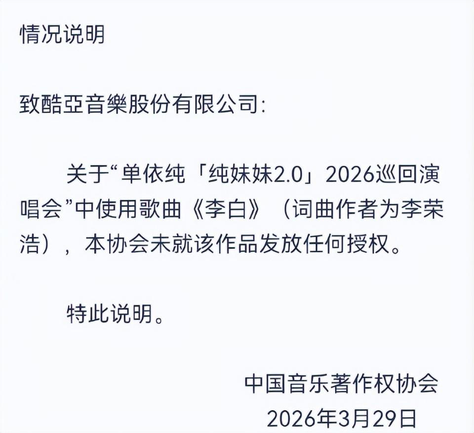 起因是单依纯在自己的最新演唱会上,唱了改编版本的《李白》,而歌曲的原作者李荣浩下午就在微博上愤怒发文,指责单依纯强行侵权演唱。