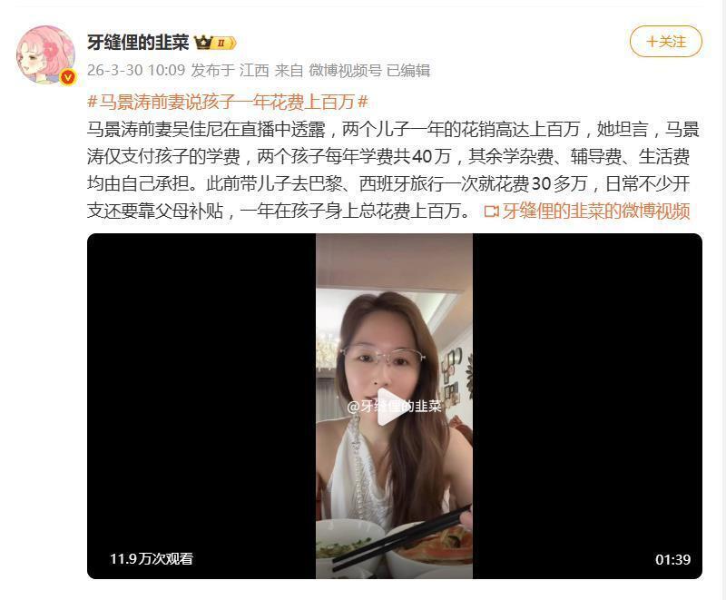 据网友 3 月 30 日爆料,马景涛前妻吴佳尼在直播中摊开了一份令人咋舌的 " 育儿账本 ":抚养两个儿子一年总花费高达上百万元。她坦言,前夫马景涛只负责支付孩子们每年的学费共计 40 万元,其余庞大的开支——从学杂费、辅导费到全球旅行、日常吃穿——全部压在她一人肩上,甚至还需要自己父母的补贴来填补缺口。
