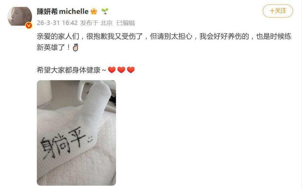 就在工作室发布声明的同一天,陈妍希本人也在个人社交账号发文向粉丝报平安。她的语气显得颇为轻松:" 亲爱的家人们,很抱歉我又受伤了,但请别太担心,我会好好养伤的,也是时候练新英雄了!" 文末还不忘提醒大家注意身体健康,并配上了一张 " 躺平 " 休息的照片。