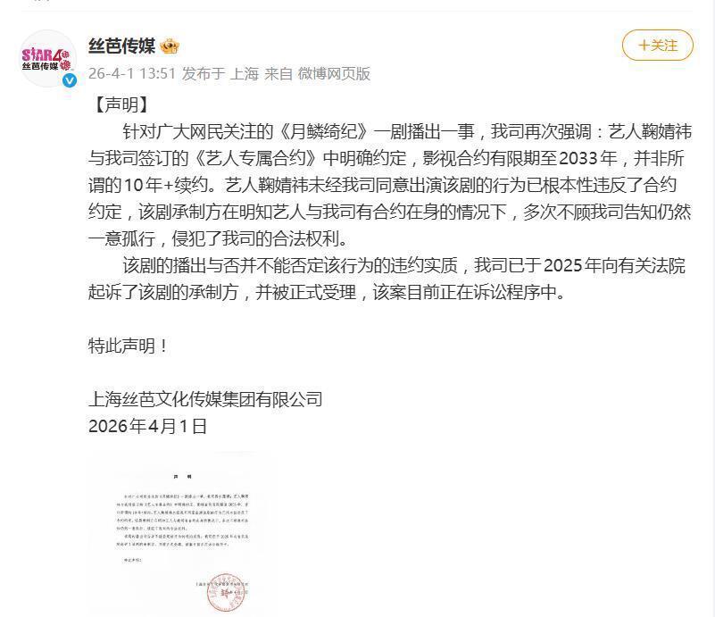 一纸声明,让本就备受关注的《月鳞绮纪》再添一把火。4 月 1 日,丝芭传媒发布正式声明,不仅强硬指控旗下艺人鞠婧祎 " 根本性违约 ",更宣布已于 2025 年起诉该剧承制方,直指对方 " 明知故犯,一意孤行 "。