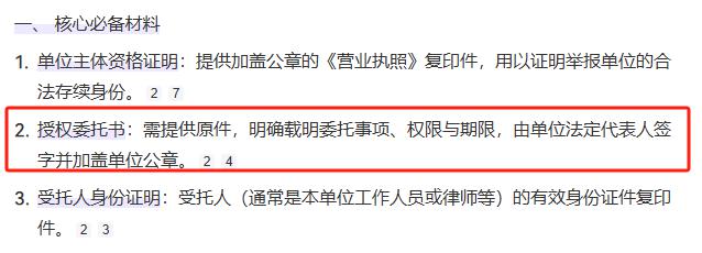 也就是说,举报材料本身盖章并非必要条件,盖章的委托书是证明举报人与举报单位之间的关系。