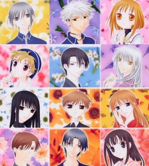 性情急躁的“猫”草摩夹、个性温和的“鼠”草摩由希、双重性格的“牛”草摩泼春、可爱温柔的“虎”草摩杞莎、开朗热情的“兔”草摩红叶、稳重善良的“龙”草摩羽鸟、自恋吵闹的“蛇”草摩绫女、外冷内热的“马”草摩依铃、人小鬼大的“羊”草摩灯路、胆小自卑的“猴”草摩利津、尽职尽责的“鸡”草摩红野、顽皮幽默的“狗”草摩紫吴、执着勇敢的“猪”草摩乐罗。十三个被诅咒的人,组成了“水果篮子”,真挚的情谊让他们相互体谅,共同面对宿命。