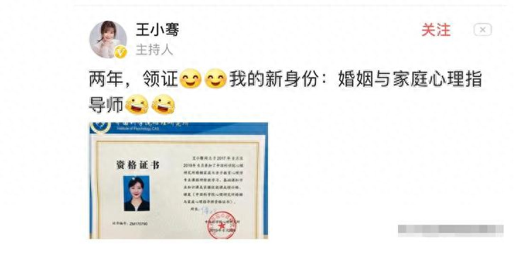 她曾经晒出自己考取“婚姻与家庭心理指导师”的资格证照片,并写道这是自己的新身份。