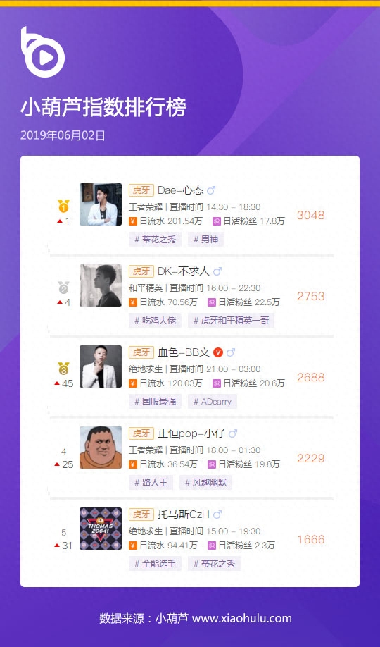 6.02丨五位虎牙主播同时登上指数榜 心态单日礼物收入超200万元