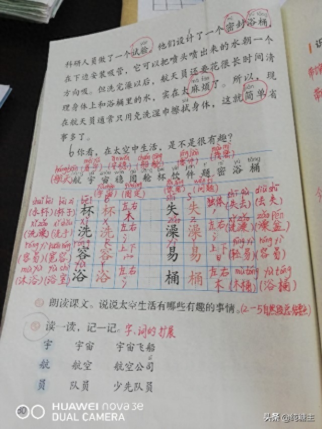 学习目标:1、要求会写“杯、失、洗、澡、容、易、浴、桶。” 2、会认“航、宇、宙、稳、固”等13个生字。3、学会文中“太空、生活、宇宙飞船、别处”等词语。