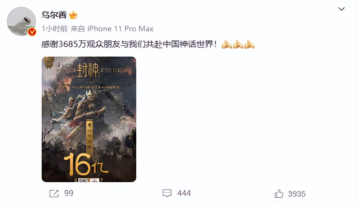 同时,《封神》导演乌尔善发布微博,感谢目前观看该作的超过3685万位观众。