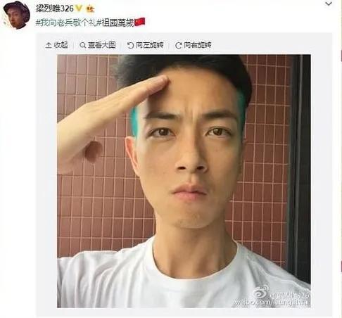 最开始梁竞徽在微博上发了一张向抗日老兵敬礼的图片,没想到被香港废青攻击。