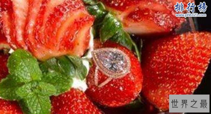 这款天价甜点来自新奥尔良,是由阿尔诺餐厅推出的,它价值985万美元,至今未被超越。它的价格为什么那么贵呢?当然是由原因的。它的主要原料草莓是非常新鲜的特供产品,另外点上一份这个,你可以额外享受昂贵的酒和香槟,以及24克拉的金箔,购买一份这个用来求婚也是可行的,因为它连戒指都为你准备好了,而且戒指的成色非常好,是一枚10.06克拉的蓝钻戒指。