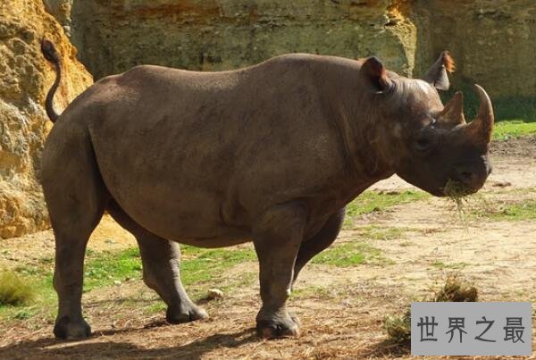 黑犀是一种体长在3至3.75米之间的犀科黑犀属动物,是以丛林地带为主要栖息地,以树叶为进食对象的分布较广,数量第二多的犀牛,而这种犀牛还被非洲国家莱索托列为国兽。