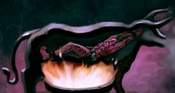 最早是由古希腊人安排出来的,装备是用青铜铸成的巨细跟牛一般的用具,极刑犯被闭在牛的体内,而后牛身底下搁着炉火在烧,直至内里的人被活活烧死为止。