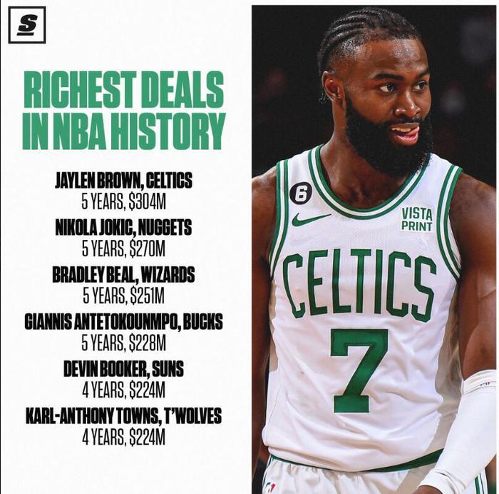 The Score列出了NBA历史最大的6份合同:杰伦-布朗的5年3.04亿,尼克拉-约基奇的5年2.76亿,布拉德利-比尔的5年2.51亿,扬尼斯-阿德托孔博的5年2.28亿,德文-布克和卡尔-安东尼-唐斯的4年2.24亿。