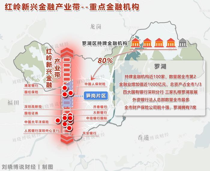 我们说几组数据,足以看出罗湖金融业的彪悍:罗湖持牌金融机构数量居深圳第二,80%就集中在红岭新兴金融产业带,产业带贡献出42%的GDP和46%的税收。这是什么概念?按照营收计算,每平方公里营收达1000亿元,何止寸土寸金?
