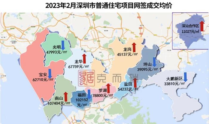 从置业的角度,买在罗湖也比买在福田、南山核心区资金压力小很多。从易居克而瑞统计的2月深圳市各区住宅成交均价图上,这一点非常直观。