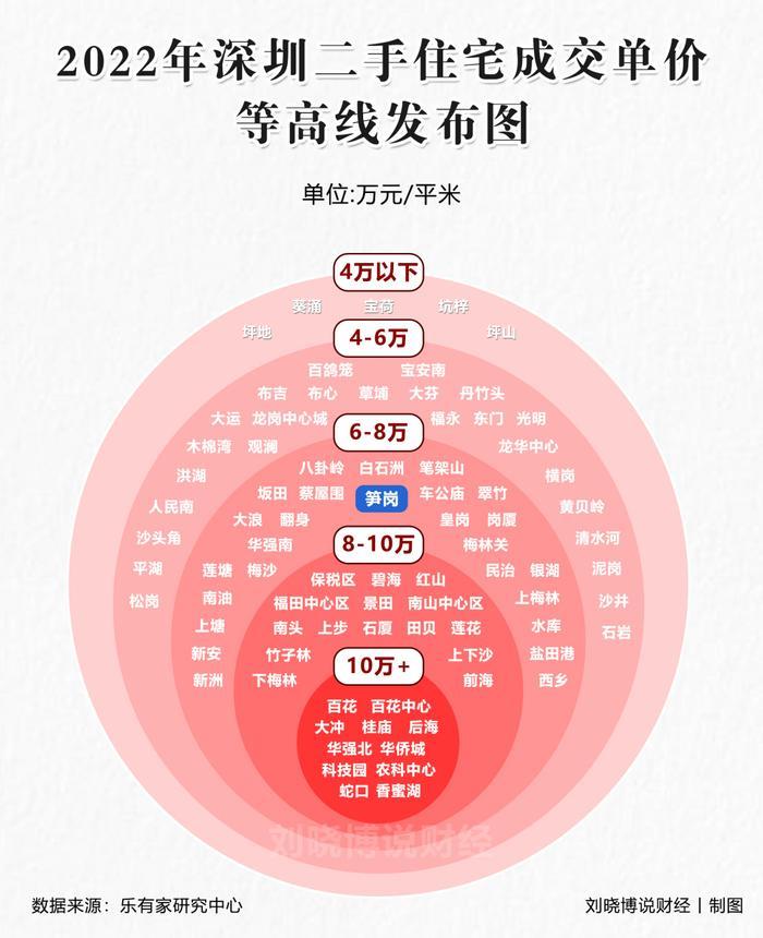分片区来看,体会更加明显。乐有家统计了2022年底深圳二手房成交均价,置业笋岗不过6-8万/㎡;而同等配套齐全、小区优质的项目,在南山、福田好多都要10万+。