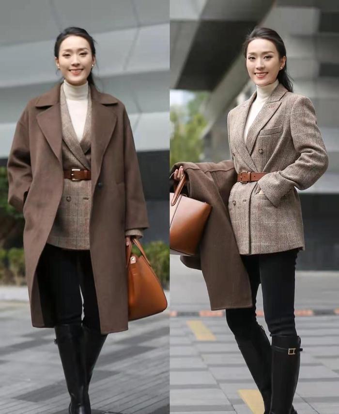大衣的版型优势不仅表现在包容身材的不足,同时它也可以容纳更多的上装,实现叠穿的高级穿法。例如图中这位博主,就使用了三件上装,将高领打底衫、西装、大衣,由里到外依次排列,层次感瞬间就被凸显出来,看上去大气干练又不失时髦。