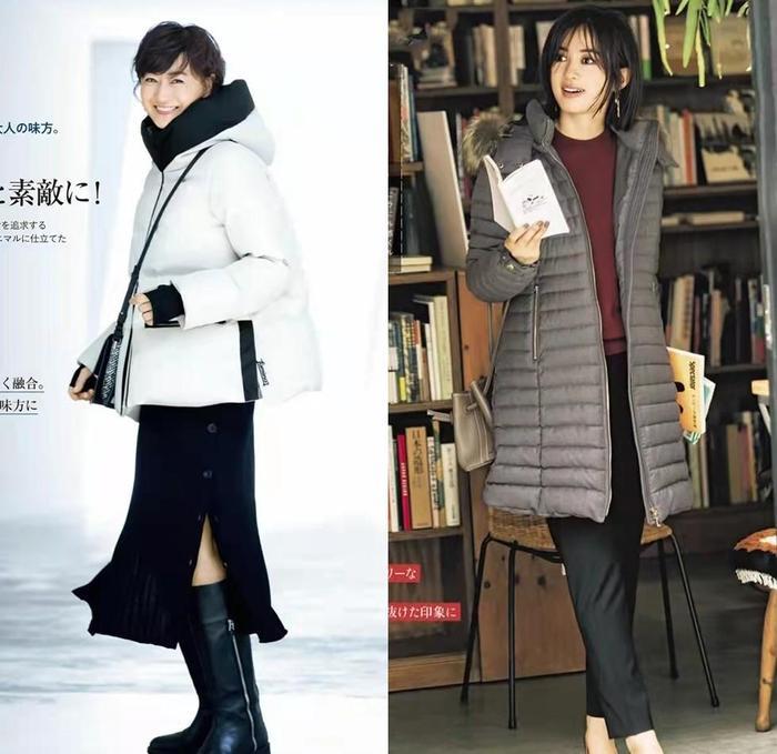 像图中这两款羽绒服,分别由白色和黑色设计,其中可以看出,白色可以使穿搭看上去更柔和,人看上去更温柔恬静,而黑色给人的感觉就要干练严肃一些。