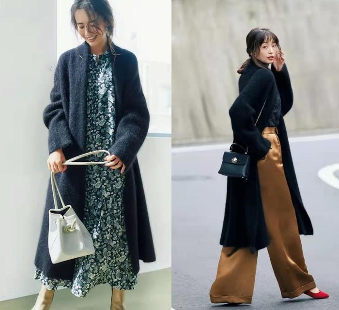 针织面料的面料因为过于柔软,所以会显得不太有型,而当针织开衫设计为长款时,它的轮廓线条会比较模糊,因此还是要考虑敞开穿着,可以避免显得身材臃肿,或是加入腰带,强化视觉上的线条感,拉伸体型。