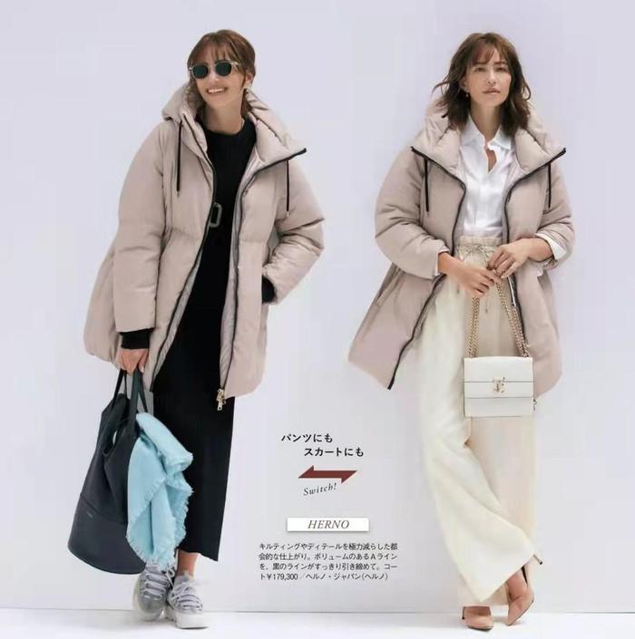 比如图中这件羽绒服,它的色调比较简单,不仅可以减少年龄感,同时在搭配上也会比较简易,像是采用白色衬衫+米色阔腿裤,就可以延续时尚又优雅的风格。