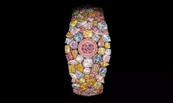 萧邦这款腕表虽然形态有些怪异,但却是一款真材实料的大师级作品。这款腕表由201克拉的钻石镶嵌而成,其中包括15克拉粉钻、12克拉蓝钻、11克拉白钻、163克拉小黄钻和白钻。874颗钻石围绕在表盘周围,构成了花团锦簇的感觉,既是土豪,也是艺术!这块表已经明码标价1.65亿元,是世界上最贵的手表之一。