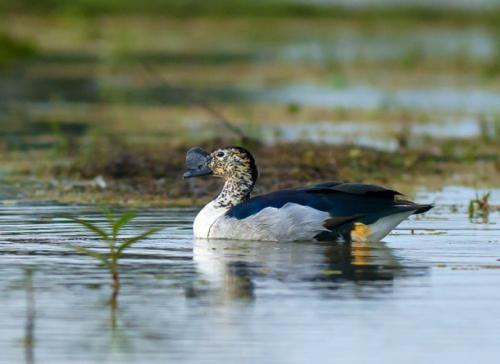 旋嘴鸭又称梳鸭,是一种独特的物种,因为雄性鸟类的嘴上有黑色的大旋钮,该物种见于撒哈拉以南非洲,马达加斯加和南亚的热带湿地。水禽最大的种类之一。成年鸭子的头顶有雀斑,侧面有深色的侧面;脖子和下部是白色的。上部是光滑的蓝黑色,带蓝色和绿色的虹彩。