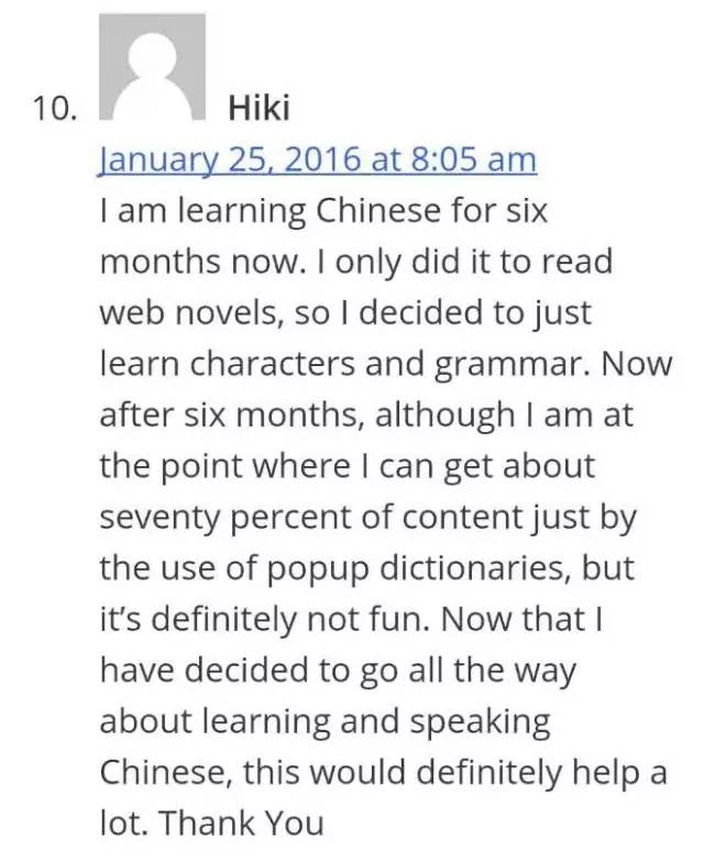 我学华文六个月了,只为了瞅搜集演义,所以只学了汉字和语法。当前固然我能借帮弹窗词汇典瞅懂70%的实质,然而是一点趣味也不。所以当前我决断从新学华文,读和说都学起来,这千万于更有用。
