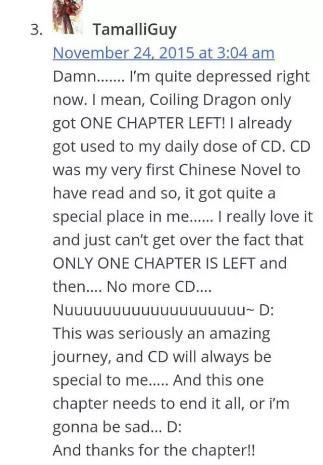 活该……我当前难受极了。我是说,《盘龙》只剩一章便闭幕了!我曾经习气天天追文了!这是我瞅的第一册中国演义!它对于我来说意思特殊是……我果然很喜佳这部演义,果然无法接收再一章便闭幕了,以来都不《盘龙》了呜呜呜呜……这本书籍果然是一场神秘的路径,《盘龙》将向来在我内心吞噬特殊的位子。只剩一章了,我太悲伤了。感动翻译君。