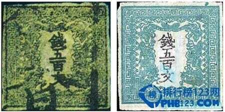 世界最珍贵的孤本邮票之七:“钱五百文”中心倒印龙票:(日本 – 1871年)