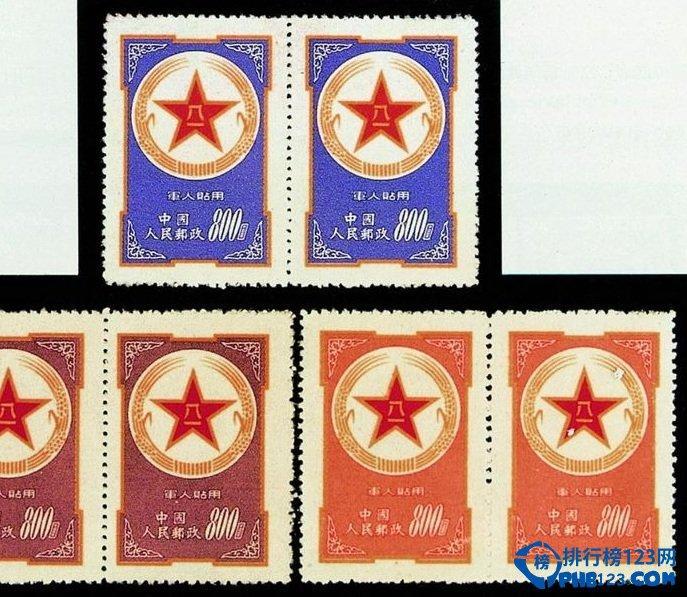 1953年中国邮电部和军委通信部联合决定发行一套军用邮票,分三枚,图案相同,面值相同,底纹刷色则分别为桔红色、棕色和蓝色,在集邮界俗称为“红军邮”“黄军邮”“蓝军邮”。三种邮票印量分别为4250万枚;3250万枚;3250万枚。本来拟定于1953年9月开始下发使用,但是在下发过程中发现没有信箱代号的情况下容易泄露部队番号,而且使用对象不易控制。因此最后决定停用。当时已有部分黄军邮下发,而蓝军邮在8月24日才印毕,因此流出极少,成为珍邮。1999年8月,一枚蓝军邮四方连以374万元人民币的价格拍出。