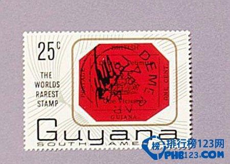 1856年初,英属圭亚那当地的邮票短缺,新印刷的还未从英国送到,因此只能在当地报纸印刷厂内赶印了少量的洋红色1分和蓝色4分邮票。这些邮票印刷的非常粗糙。其中洋红色一分邮票主要用来贴用新闻报,因此非常罕见。1922年,美国集邮家海因德以32148美元的高价买走。海因德逝世后,该邮票又数易人手,1980年该邮票以93.5万美元的高价拍出,是迄今为止世界第二贵的邮票。