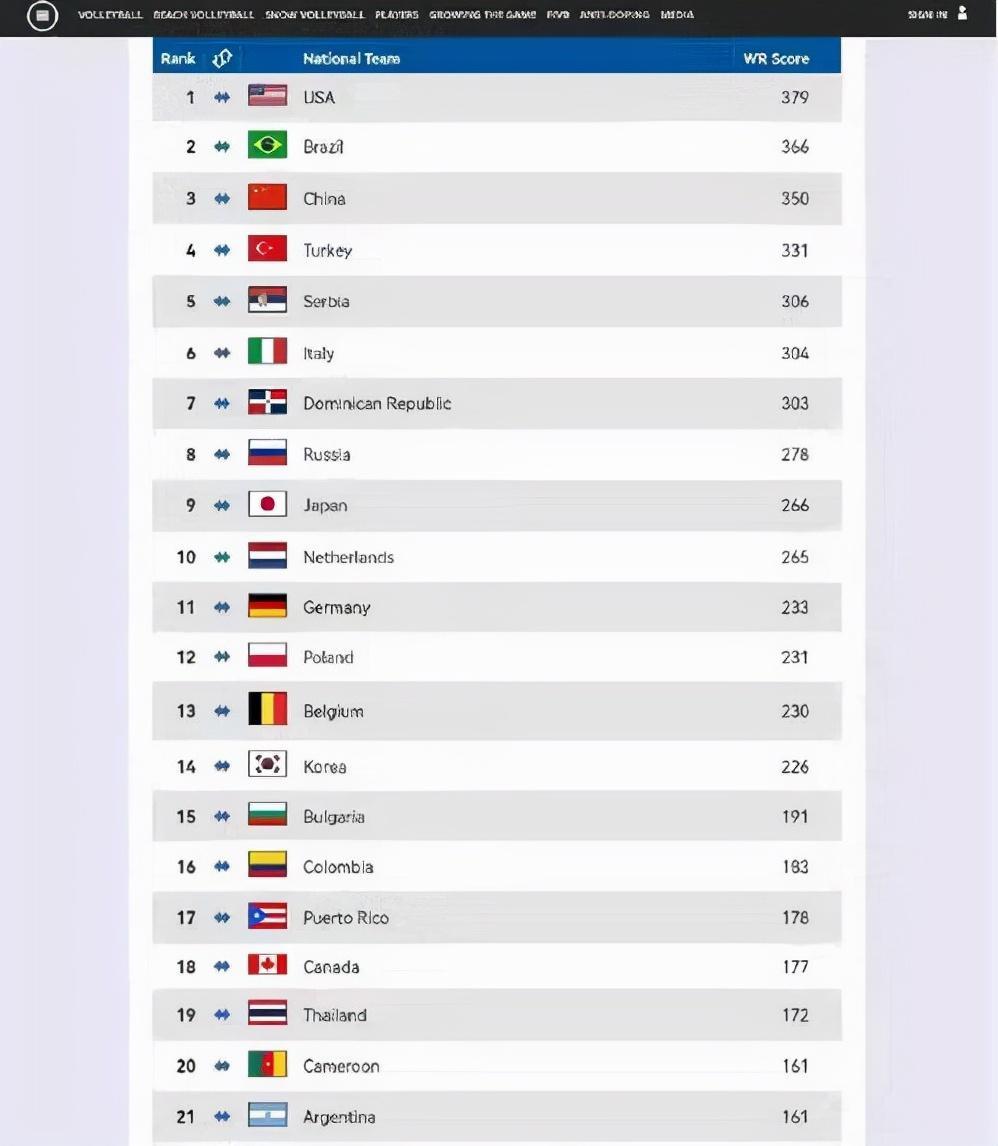 北京时间2022年1月4日星期二消息。国际排联公布了最新一期世界女排球队的排名情况。中国女排以总积分350分,位列世界第3名。排名第一的是新科奥运冠军美国女排。第二名是08、12年两届奥运会的冠军巴西女排。——前三名,刚好是最近4届奥运会的冠军!