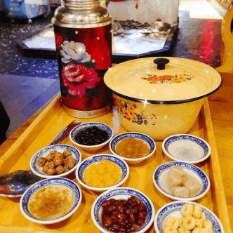 它们家还自创了暖壶奶茶冰粉,用暖瓶盛上甜滋滋的奶茶,倒在满满一大碗的冰粉上,然后放上芋圆、红豆、葡萄干等诱人的食材,一大碗奶茶冰粉就做好了。